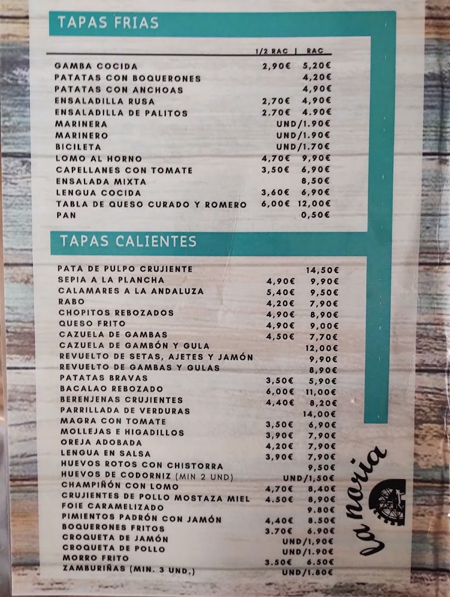 The menu at Cafetería Bar La Noria offers a variety of traditional Spanish tapas and cafeteria-style dishes. Visitors can find a selection of small plates including classic tapas such as patatas bravas, queso frito, and bacalao rebozado, alongside other options like parrillada de verduras, marinera, cazuela de gambas, and champiñones. The food choices suit casual dining, light meals, or snack options often enjoyed with beer or other beverages.